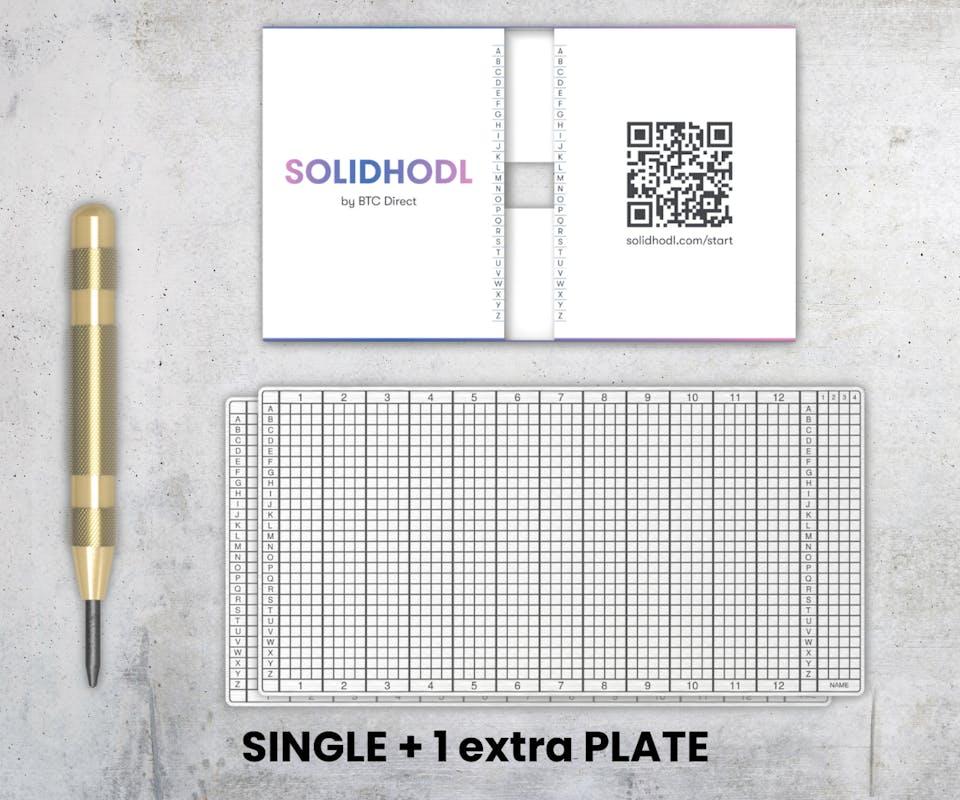 SOLIDHODL (SINGLE): 1 x SOLIDHODL plate 1 x Sleeve (to prevent errors) 1 x Automatic puncher (for punching the letters into the stainless steel)